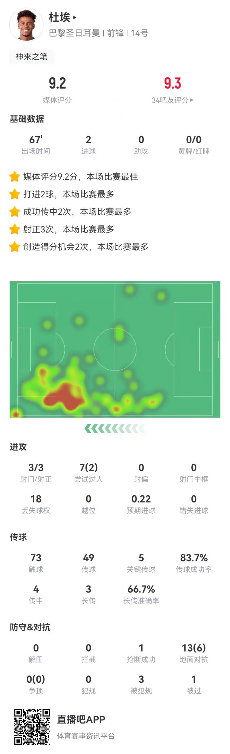2月18日讯 巴黎在本轮欧冠3-2逆转摩纳哥,杜埃本场数据: